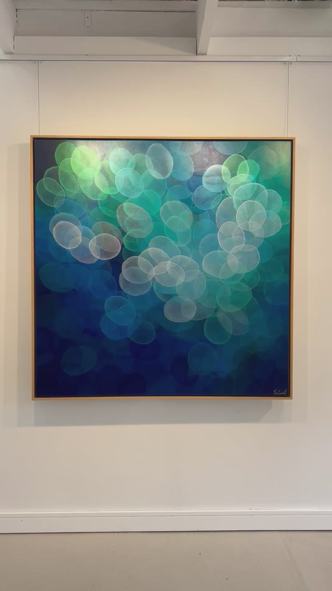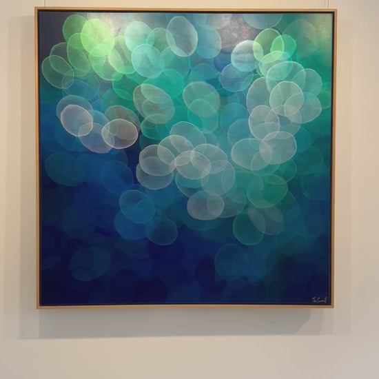 Lumin Tide is a serene immersion into light, colour and quiet movement. Soft overlapping ellipses of blue, turquoise and pale white appear to drift and glow like illuminated currents rising through clear water. The palette shifts from deeper indigos into lighter aqua tones, creating the feeling that light is travelling upward and dissolving into air.