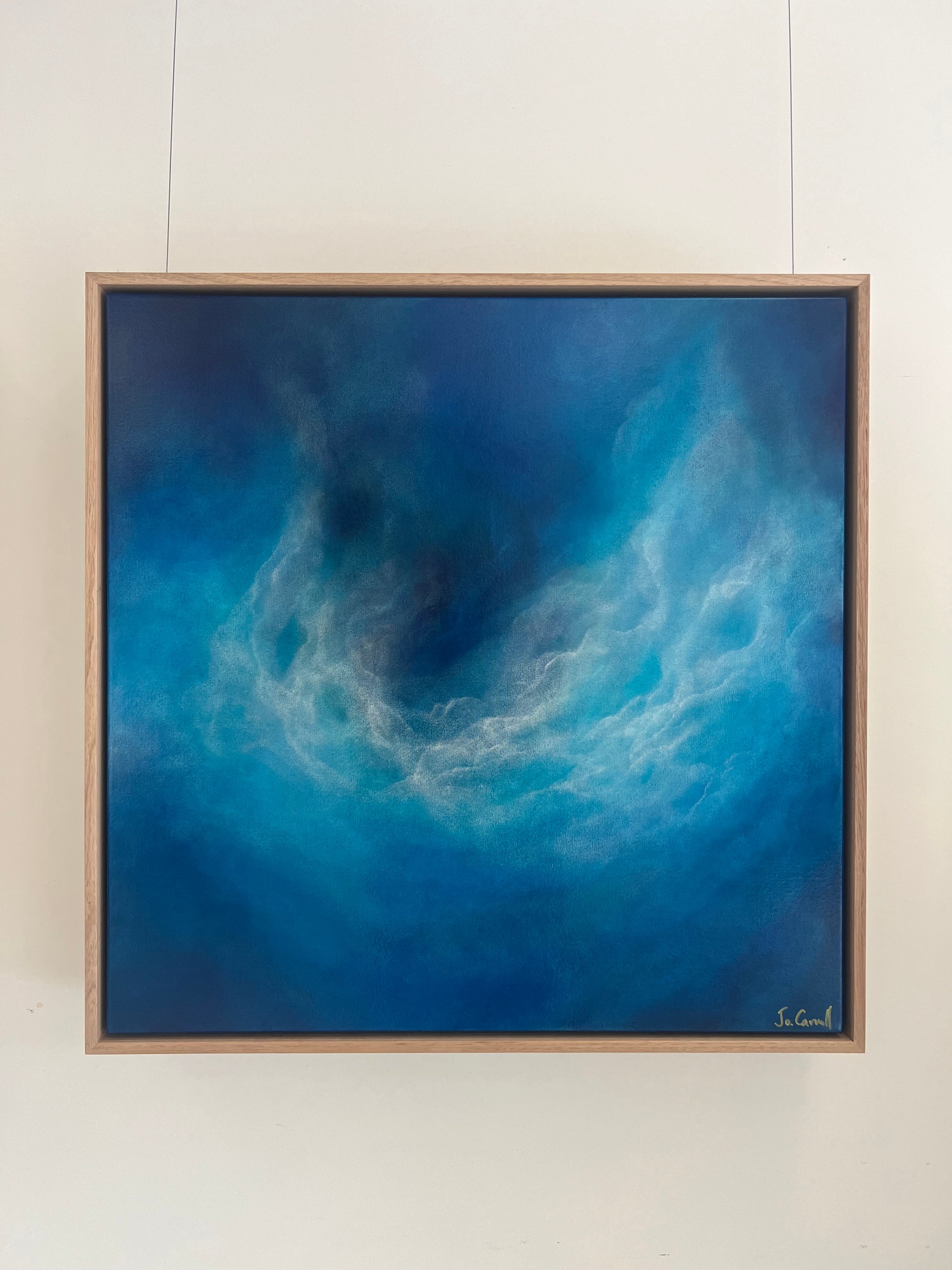 "Skywell" invites you to pause and look into the quiet depth beneath the surface of everyday life. This piece feels like an opening into the unseen. A portal where sky and water merge into one luminous field. Layers of soft cloudlike pigment draw you toward a centre of calm, encouraging you to inhale a little slower and sink into the stillness.