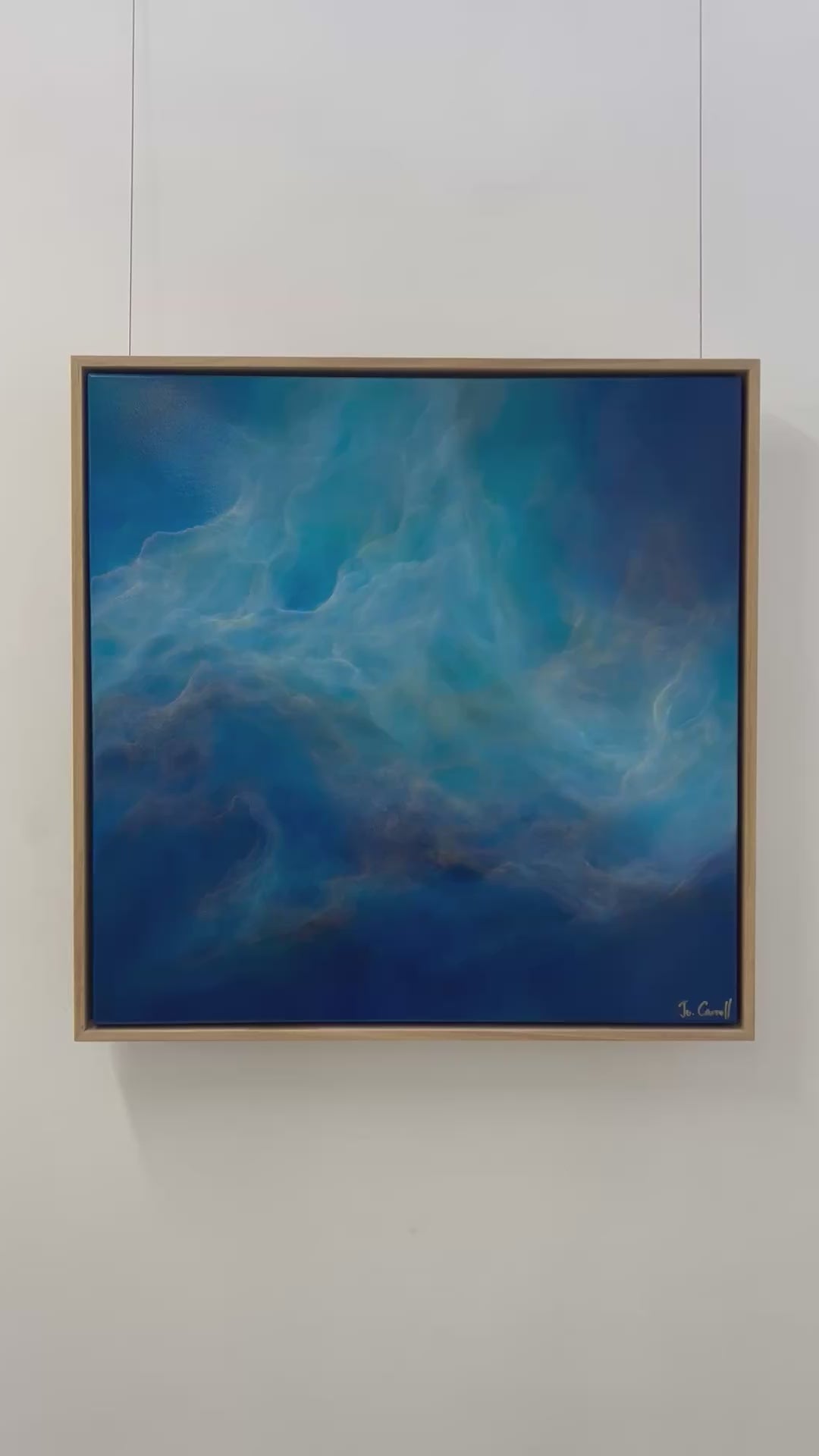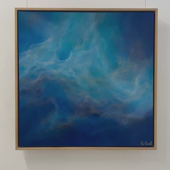 This original artwork holds the contemplative mood that collectors of my ethereal art seek. Ideal for creating a peaceful focal point in living rooms, bedrooms and meditation spaces. Celestial Mist is framed and ready to hang. A true statement for those drawn to atmospheric abstract art, cosmic inspired art and soothing blue artworks that evoke tranquillity, presence and quiet emotional expansion.